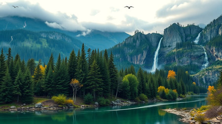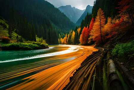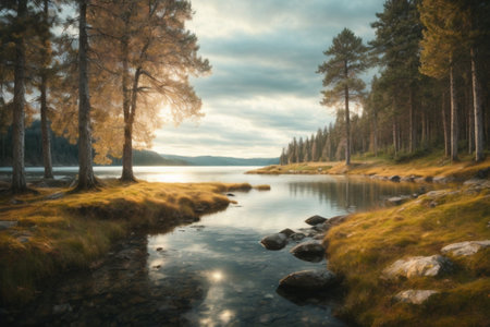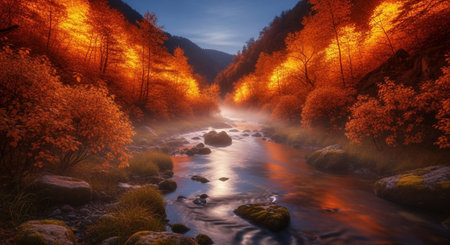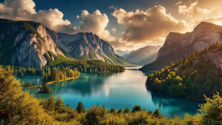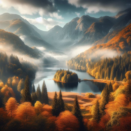 Stunning autumnal scene of a mountain lake with vibrant fall foliage. Golden hour light bathes the landscape in warmth.