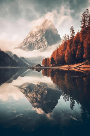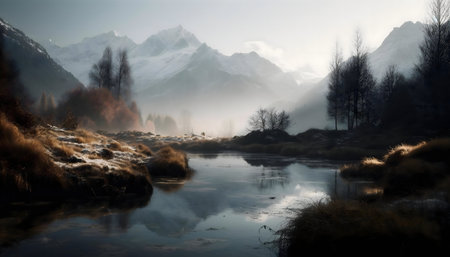 Misty mountain lake reflecting serene landscape