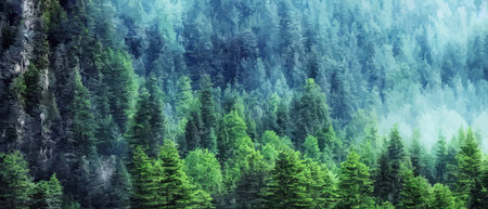 Misty landscape with a fir forest in a hipster vintage retro style. Ideal for adding a nostalgic, atmospheric touch to your designs, perfect for print, digital projects, and aesthetic visual content.