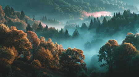 A peaceful dawn reveals lush, dark green trees shrouded in gentle fog, stretching across undulating hills beneath a calm, pale sky, capturing tranquil wilderness serenity