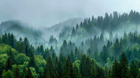 A stunning aerial view of a lush green forest canopy surrounded by mist, showcasing the beauty and tranquility of nature. Perfect for eco-friendly themes.