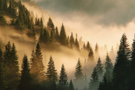 Foggy morning in the coniferous forest in the mountains