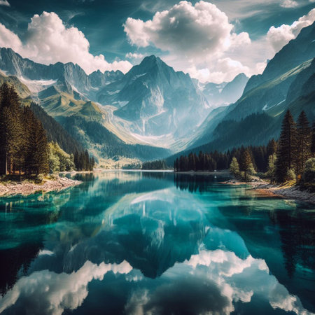 Mountain lake in the Alps at sunset. Landscape with mountains and lake.