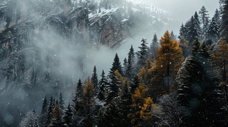Foggy winter landscape with coniferous forest in mountains.