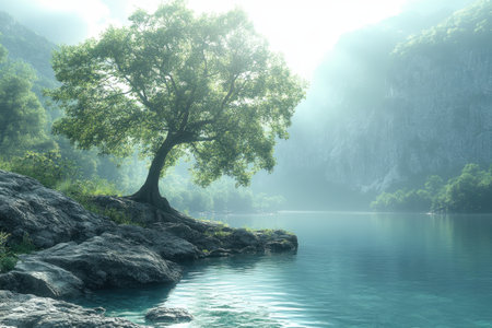 A serene lakeside view featuring a solitary tree surrounded by misty mountains in the soft morning light.