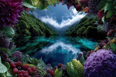 Vibrant flowers frame a serene lake reflecting a lush forest and dramatic sky creating a magical atmosphere.