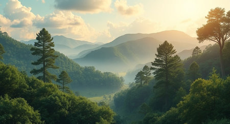 panoramic view of beautiful mountain landscape with coniferous forest
