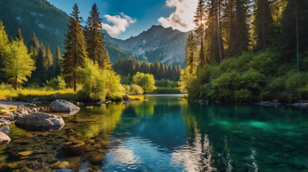 Beautiful mountain landscape with a river and a green forest in the background