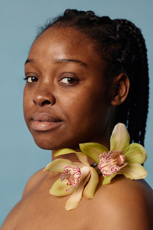 Vertical closeup portrait of beautiful young Black woman with no makeup posing for camera with fresh orchid flowers
