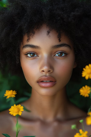 A young woman with natural curly hair gazes directly at the viewer, framed by bright yellow flowers. The background is filled with rich greenery, creating a serene and refreshing atmosphere during a sunny day.
