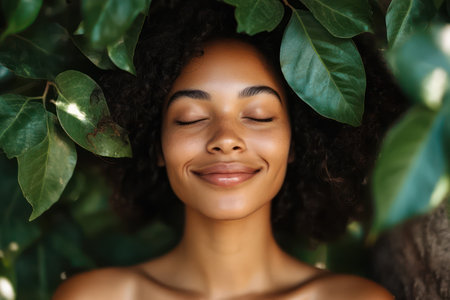 A tranquil woman closes her eyes, enveloped in the calm of dense green leaves, in a moment of peace