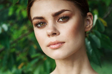 smiling woman Cosmetology nature green leaves glamor cropped view