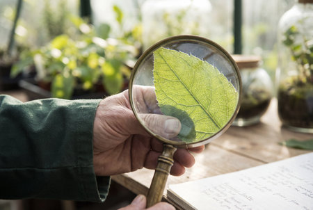 A botanist examines a vibrant green leaf with a magnifying glass, carefully inspecting its cellular details as part of scientific observation and plant analysis, in a lab environment