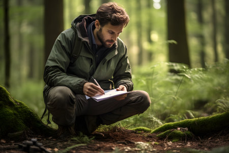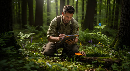 A focused researcher wearing a mask surveys a lush forest environment, documenting observations on a clipboard, promoting ecological conservation and study.