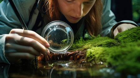 A close-up shot features a hand holding a magnifying glass, focusing on vibrant green moss and a tiny plant in a forest setting, highlighting nature's details.