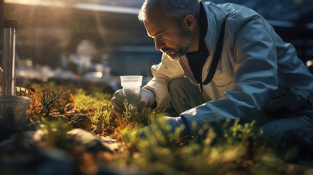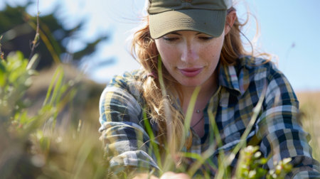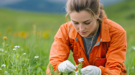 Researcher wearing gloves carefully examines plants and soil in a vibrant field, conducting ecological research amidst natural beauty