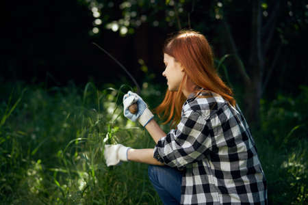 Scandinavian female forester walks around her territory and checking the safety of the trees. She holding a clipboard in her hands and writes down all the changes. Caring for and preserving forests.