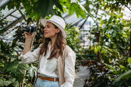 Woman uses smartphone to take photo of green plants in the greenhouse.