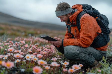Biologist using digital tablet examining flowers during field research in remote mountain environment