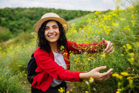 Portrait of a beautiful young woman in a red sweater and straw hat. A close-up shot of a pretty girl in a field with yellow flowers against a forest background. Travel concept