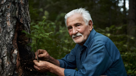 An elderly man is planting a tree. Landscaping on planet Earth.