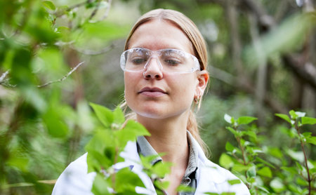 Scientist woman, plants and field research with focus, outdoor and glasses for safety, analysis and growth. Female science, forest or woods with leaves, plastic goggles or inspection for pharma study