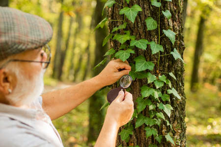 naturalist with a beard examines a large yellow maple leaf on a tree branch through a large magnifying glass on a bone handle