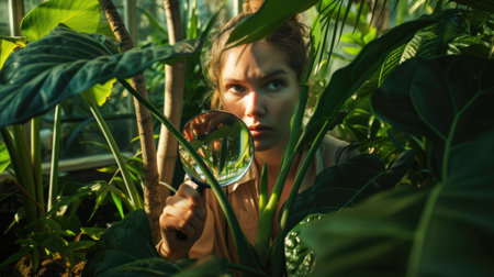 The picture of the botanist holding the magnifying glass inside the greenhouse has been surrounded with green tree and plant, the botanist require skill like plant identification and knowledge. AIG43.