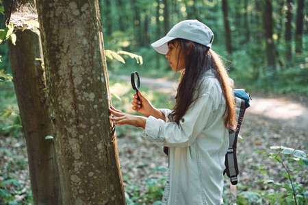With magnifying glass. Girl is in the forest at summer day time discovering new places.