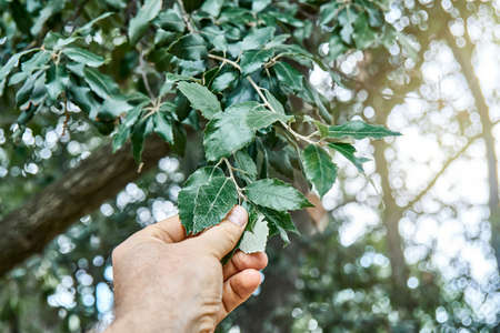 Man hand touches lush leaf of quercus ilex in sunny park close view. Exotic plant grows in city garden. enjoying nature beauty during travel