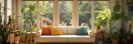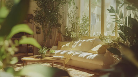 A serene indoor living space featuring a cozy sofa with vibrant cushions, surrounded by lush greenery and bathed in warm natural light, perfect for relaxation.