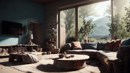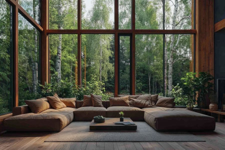 An interior shot showcases a contemporary living space featuring a large sectional sofa. The room is bathed in natural light filtering through expansive windows, framing a lush mountain view. The composition highlights textures and tones, suggesting a blend of comfort and design for various lifestyle applications.
