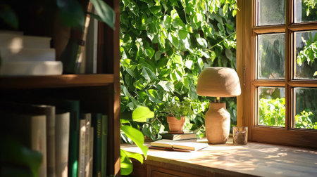 Beautiful indoor scene featuring a window adorned with lush green plants, a cozy lamp, and a warm wooden table, creating a serene and inviting atmosphere.