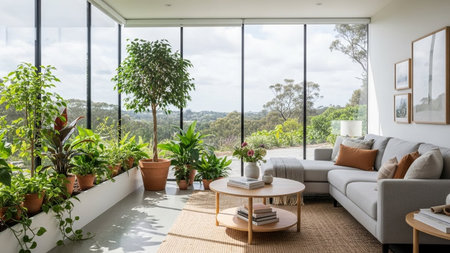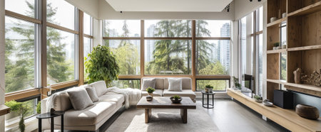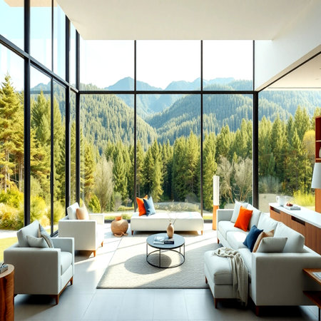 A bright and inviting modern living area featuring large windows that showcase lush greenery. This cozy space includes stylish furniture, vibrant decor, and a relaxing atmosphere ideal for unwinding or enjoying a serene view of nature.