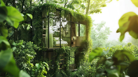 A cabin nestled amidst a dense forest setting. The building is enveloped by foliage, with a design that blends into the environment. The composition employs natural light, showcasing the wooden structure. Suitable for illustrating concepts of nature, seclusion, and retreat, for possible commercial use.