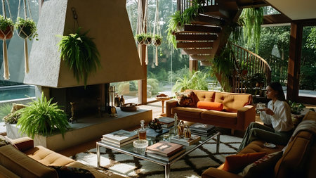 A cozy mid-century modern living room with large windows, featuring orange sofas, decorative plants, and colorful wall art