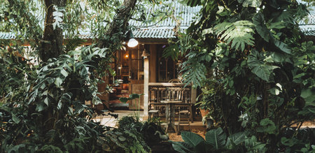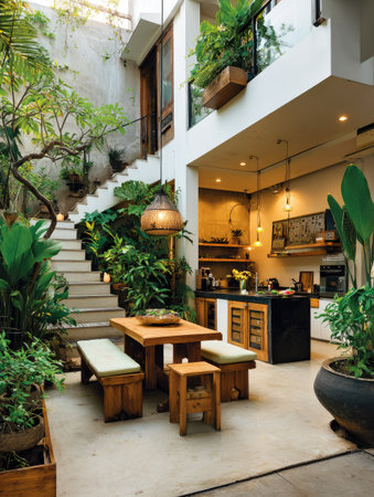 An outdoor dining area is shown with a large wooden table and benches, surrounded by abundant greenery. The scene features a combination of architectural elements and natural textures, with soft lighting enhancing the atmosphere. This image is suitable for use in design, lifestyle, and editorial projects.