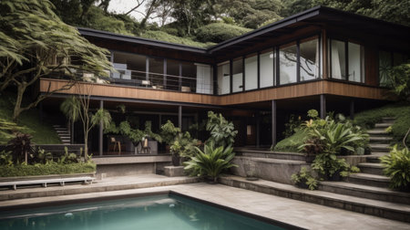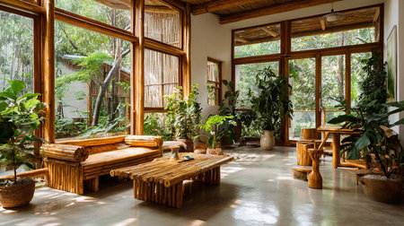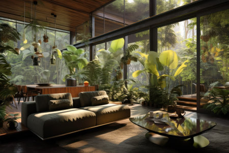a spacious house with glass walls and many plants inside and immersed in greenery outside. an oasis of beauty and tranquility. generative Ai,