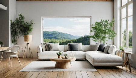 3D rendering of a living room with a white sofa and coffee table, a mockup poster frame on the wall, green plants in pots, wooden decor elements, natural light from the window, a neutral color tone interior design, and empty space for text or product display. High resolution. --chaos 30 --ar 16:9 --v 6.1 Job ID: 35f4e9ec-0bab-47d4-8ec4-517954a45485