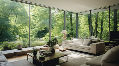 Living room filled with lots of furniture and tall glass wall with trees in the background. Generative AI.