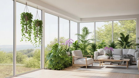 This image showcases a serene indoor space filled with lush green plants and cozy furniture, creating a tranquil atmosphere full of natural light.