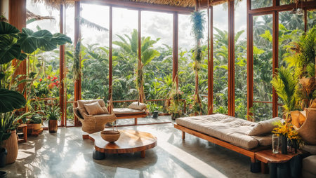 Luxurious hotel room opens onto a lush tropical garden, creating a tranquil and inviting atmosphere