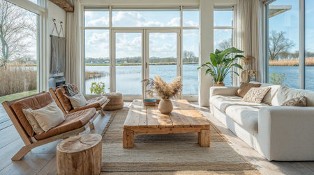An AI generated illustration of A cozy living room with large windows overlooking a tranquil Dutch lake.