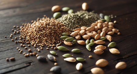 AI Generated. Varied selection of seeds and nuts arranged on a dark wooden surface highlighting culinary ingredients and healthy food options