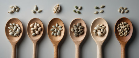 AI Generated. Variety of Natural Seeds in Wooden Spoons on Gray Background