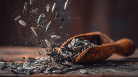 A stunning close-up of sunflower seeds pouring from a wooden scoop onto a rustic table, capturing the essence of nature's bounty in a beautifully textured setting.