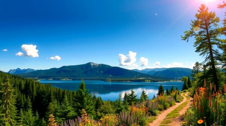 A body of water surrounded by trees and mountains. AI generative image.