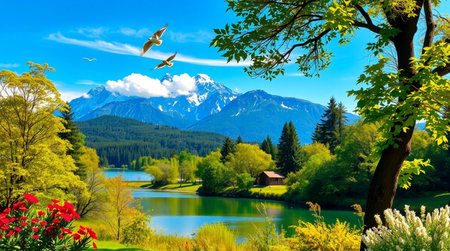 A lush green tree stands prominently in a verdant landscape under a bright sky. The scene features soft sunlight filtering through the trees, with birds soaring. The composition is balanced, showcasing a natural environment for various commercial or editorial applications.