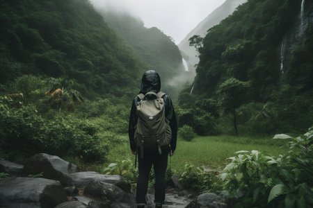 Young teenager traveler standing in rainy forest enjoying lush green trees scenery of forest nature in surrounds. Generative AI