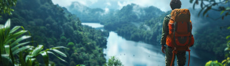Back view of man with backpack standing on edge of cliff and looking at beautiful lake with AI-Generated Images